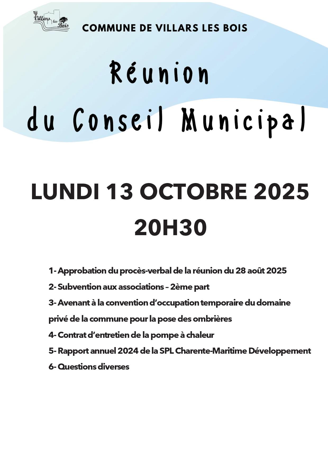 07 octobre 2025 Réunion du Conseil Municipal Réunion du Conseil Municipal le 13/10/2025 Vous pouvez trouver l'affiche pour voir l'ordre du jour ci-dessous. Pour télécharger l'affiche ci-dessous affiche CM.pdf Document Adobe Acrobat 109.3 KB Télécharger tagPlaceholderCatégories : Écrire commentaire Commentaires: 0